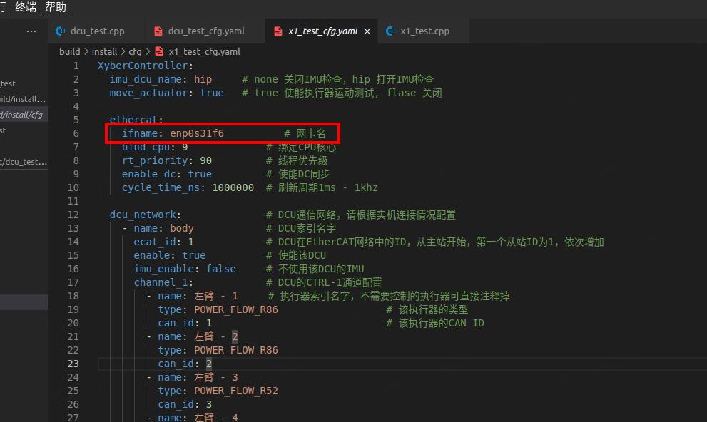2.进入 cfg目录,打开 x1_test_cfg.yaml,修改对应的网卡名称,也可以屏蔽掉缺失的关节。若不希望执行器运动,可以将 move_actuator 字段设为 false,这样测试程序只会对执行器进行使能操作以验证整机通信。imu_dcu_name 字段可以开关IMU数据的检查,详见注释。